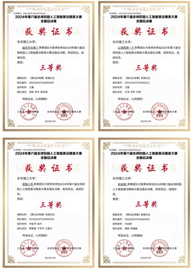 由爱体育官方网站吴超、胡瑞、熊晨果组成的学生代表队获“算法创新赛-人工智能+新工科”赛道全国一等奖;刘文博、何景阳、张熙凌组成的学生代表队获“算法挑战赛-AI生成人脸图像鉴别”赛道全国一等奖,创造了学校在该项赛事的历史最好成绩。