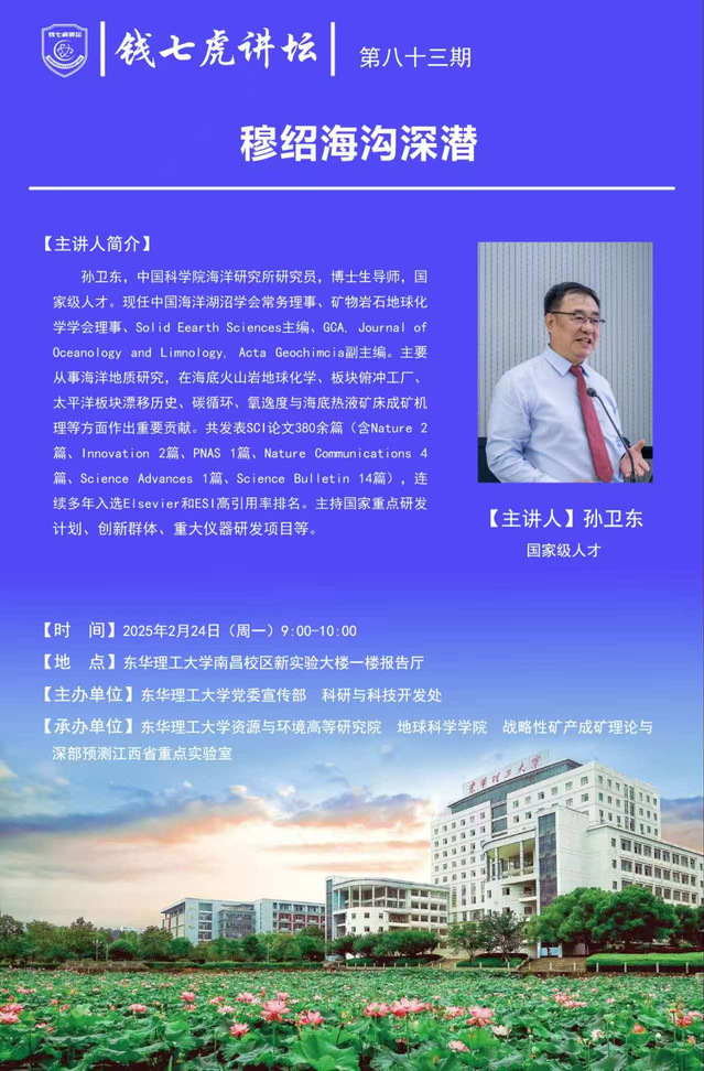 应爱体育官方网站资源与环境高等研究院、地球科学学院、战略性矿产成矿理论与深部预测江西省重点实验室邀请,中国科学院海洋研究所研究员,博士生导师,国家级人才孙卫东到“爱体育官方网站”,以“穆绍海沟深潜”为主题开展讲座。欢迎全校师生届时前往聆听。