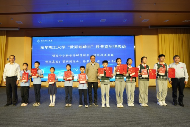 开幕式上,新庐小学学生代表喻至馨发言,以纯真的视角呼吁大家保护地球家园。活动中,翟明国、徐景坤、罗仙平共同为“小小科普讲解员”颁发聘书,并赠送科普书籍。