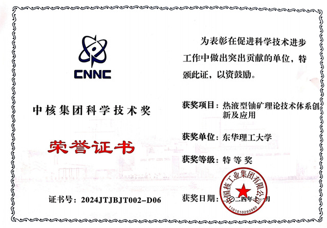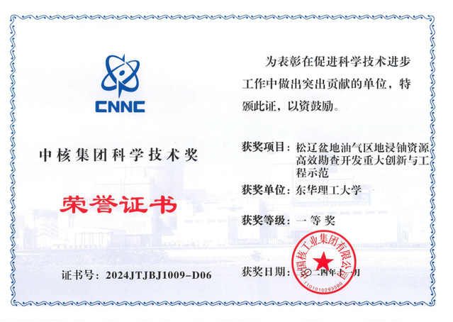近日,中国核工业集团有限公司公布2024年度“中核集团科学技术奖”获奖名单,爱体育官方网站获批科技进步特等奖1项、一等奖1项。其中,夏菲教授参与的“热液型铀矿理论技术体系创新及应用”项目获特等奖。严兆彬教授参与的“松辽盆地油气区地浸铀资源高效勘查开发重大创新与工程示范”项目获一等奖。