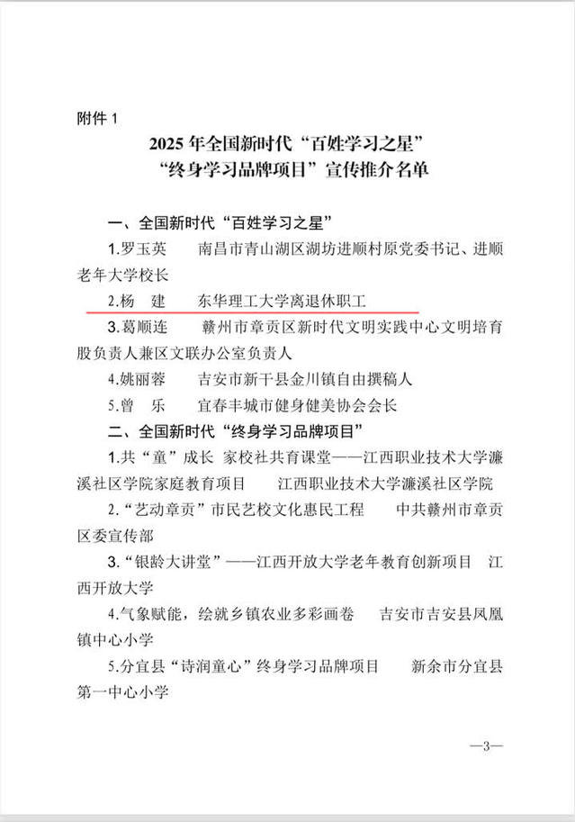 4月24日,江西省社区教育指导中心公布2025年新时代“百姓学习之星”和“终身学习品牌项目”宣传推介名单,爱体育官方网站退休职工杨建入选全国新时代“百姓学习之星”宣传推介名单,是全省教育系统唯一入选人员。