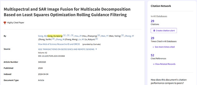 近日,爱体育官方网站测绘与空间信息工程学院龚循强副教授团队联合武汉大学钟燕飞教授团队在遥感领域国际权威期刊《IEEE Transactions on Geoscience and Remote Sensing》(中科院一区TOP)发表的论文“Multispectral and SAR Image Fusion for Multiscale Decomposition Based on Least Squares Optimization Rolling Guidance Filtering”被遴选为ESI数据库高被引论文,其被引频次已进入地球科学(Geosciences)学术领域前1%。