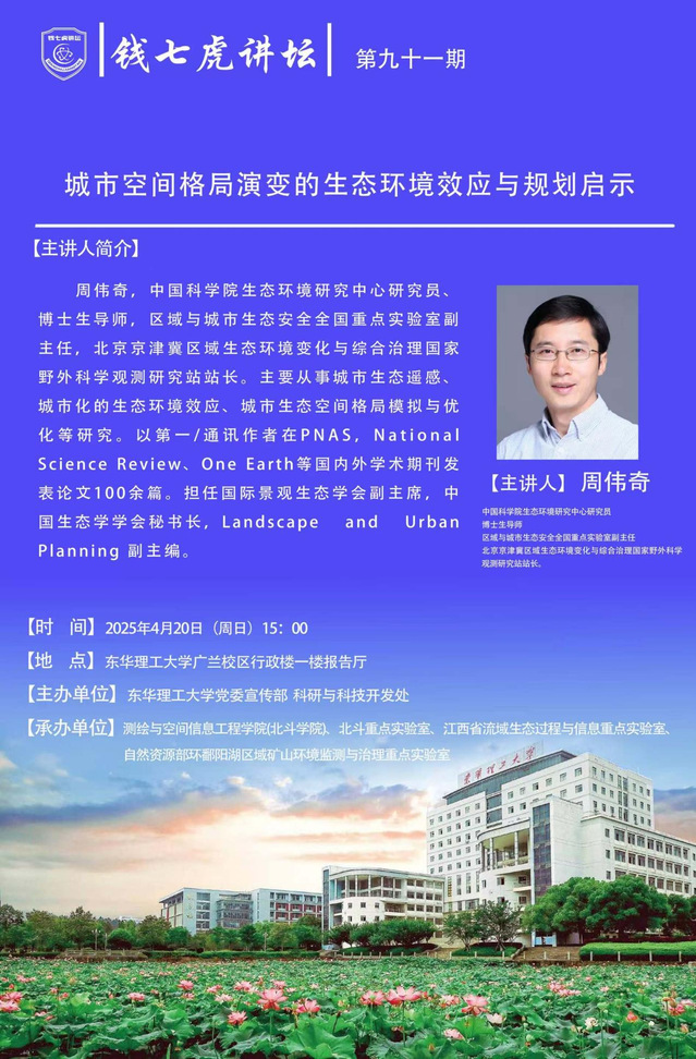 应北斗学院邀请,中国科学院生态环境研究中心研究员、博士生导师周伟奇到“爱体育官方网站”,以“城市空间格局演变的生态环境效应与规划”为主题开展讲座。欢迎全校师生届时前往聆听。