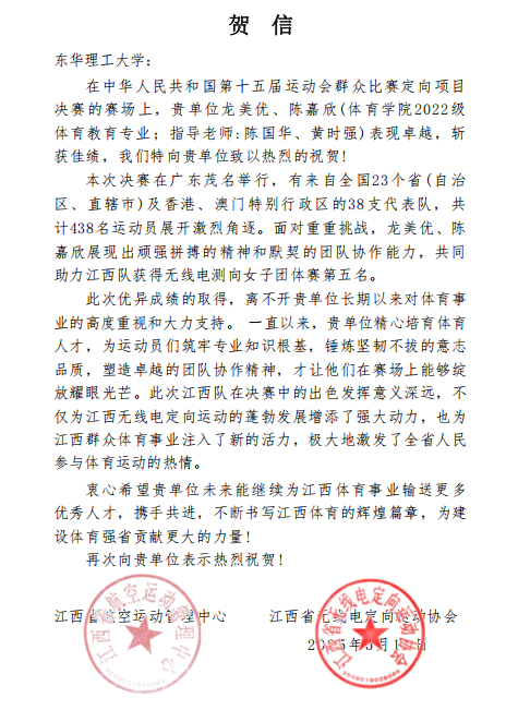 5月8日至11日,第十五届全运会首个群众赛事定向运动项目决赛在广东省茂名市举行。爱体育官方网站体育教育专业学生龙美优、陈嘉欣代表江西省参赛,获得测向比赛团体第五名的优异成绩。江西省航空运动管理中心和江西省无线电定向运动协会向学校发来贺信。