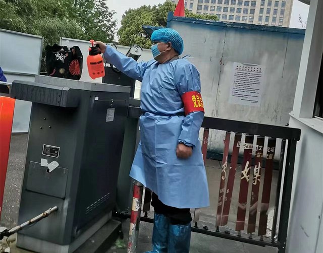 七支部书记荣海宁和丈夫陈雨田都是一线志愿者。在小区进入防控第一时间,荣海宁担任了东华锦城临时党支部副书记,与业委会一同安排防控工作。作为志愿者,陈雨田在年龄、体力上都不及年轻人,但他和年轻志愿者一道打扫卫生、搬运物资、清理垃圾。在门岗值夜班时,正值大风降温天气,寒风中,陈雨田瘦削的身躯站在门岗前,像山一样挺拔。